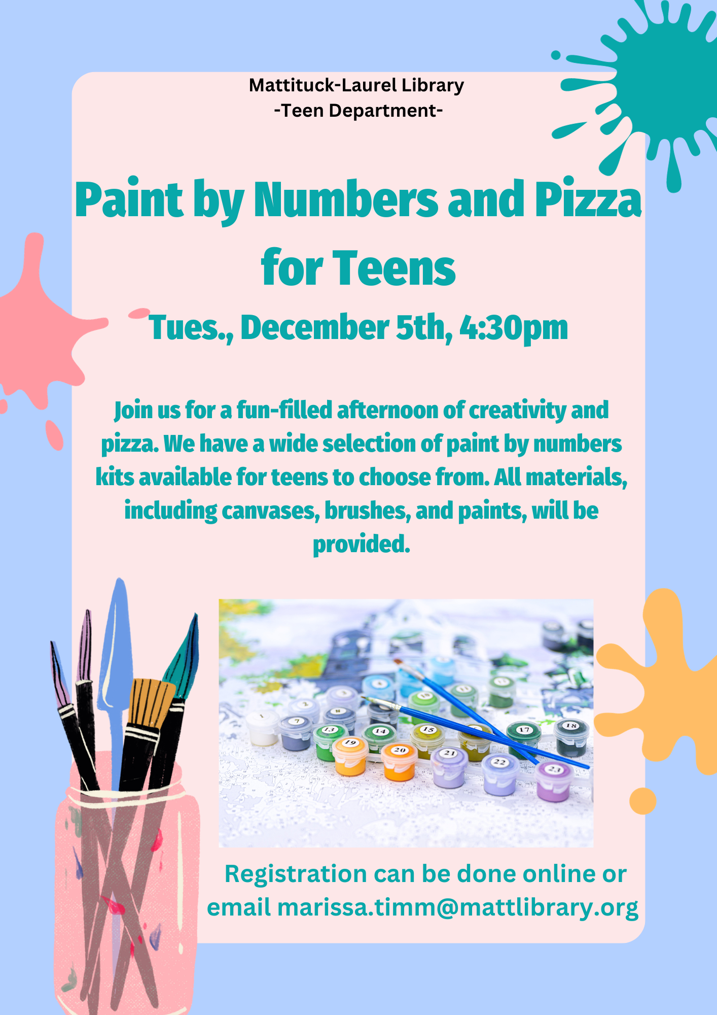 Join us for a fun-filled afternoon of creativity and pizza. We have a wide selection of paint by numbers kits available for teens to choose from. All materials, including canvases, brushes, and paints, will be provided.