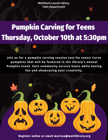 Join us for a pumpkin carving session just for teens! Carve pumpkins that will be featured in the library’s annual Pumpkin Event. Earn community service hours while having fun and showcasing your creativity.