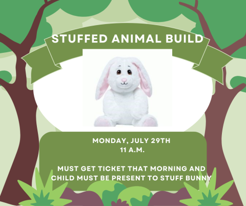 Must come into the children's room on 7/29 to pick up a ticket. First come first served. Child must be present to stuff the bunny.