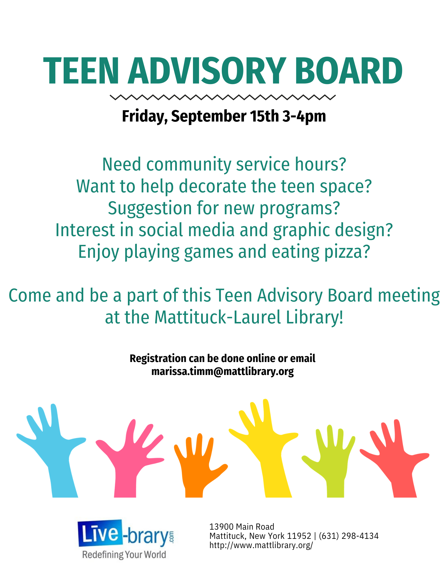 Hang with your peers, eat pizza and earn community service too! TAB is a great way for teens to get a say about library space, programs and collection.