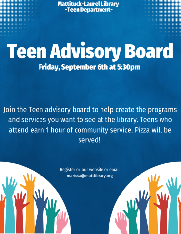 Join the Teen Advisory Board to help create the programs and services you want to see at the library. Teens who attend earn 1 hour of community service. Pizza will be served!