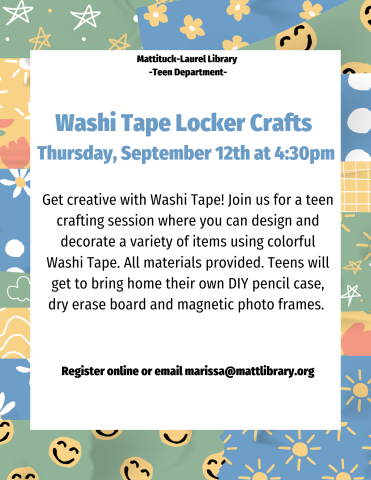 Get creative with Washi Tape! Join us for a teen crafting session where you can design and decorate a variety of items using colorful Washi Tape. All materials provided. Teens will get to bring home their own DIY pencil case, dry erase board and magnetic photo frames.