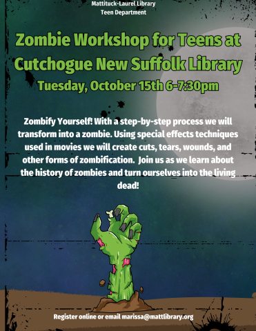 Zombify Yourself! With a step-by-step process we will transform into a zombie. Using special effects techniques used in movies we will create cuts, tears, wounds, and other forms of zombification. Join us as we learn about the history of zombies and turn ourselves into the living dead!