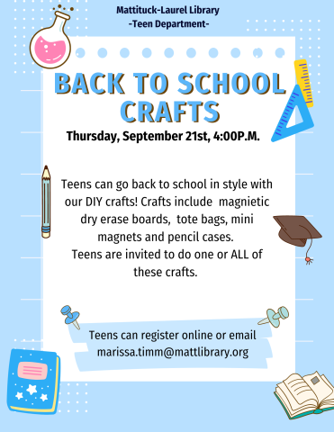 Go back to school in style with our DIY crafts. Teens will be able to create their own magnetic dry erase boards, mini magnets, tote bags and duct tape pencil cases! Each craft will have its own station, and teens will be allowed to do one or ALL of these fun crafts!