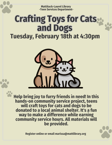 Help bring joy to furry friends in need! In this hands-on community service project, teens will craft toys for cats and dogs to be donated to a local animal shelter. It's a fun way to make a difference while earning community service hours. All materials will be provided.