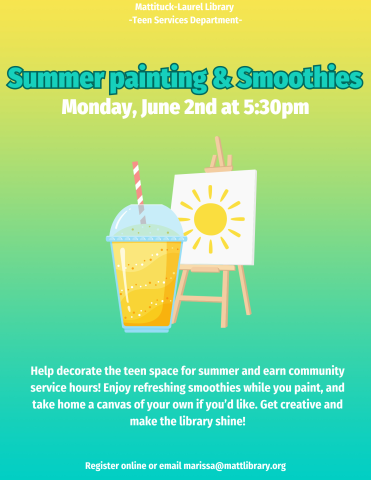 Help decorate the teen space for summer and earn community service hours! Enjoy refreshing smoothies while you paint, and take home a canvas of your own if you’d like. Get creative and make the library shine!
