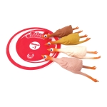 Flickin' Chicken is a crazy new yard game played with rubber chickens! Players toss the target to get started, then take turns flicking' their chicken at the target. After nine rounds, the player with the lowest score wins.