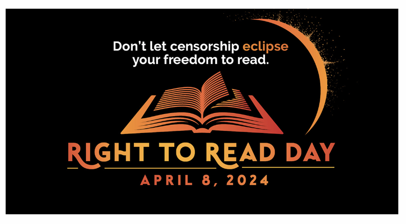 On Monday, April 8th we will be celebrating Right to Read Day along with the 2024 total solar eclipse. Right to Read Day is a National Day of Action in support of the right to read. The State of America's Libraries Report is released, including Top Ten Most Challenged Books of 2023.